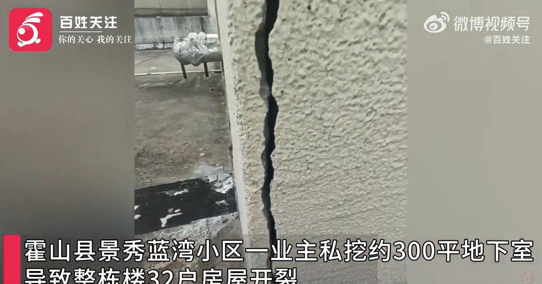 10月13日,安徽省六安市霍山县景秀蓝湾小区一业主私挖约300平地下室,导致整栋楼32户房屋开裂。该楼栋业主出示的鉴定报告显示,楼栋安全性等级综合评定为Cu级。